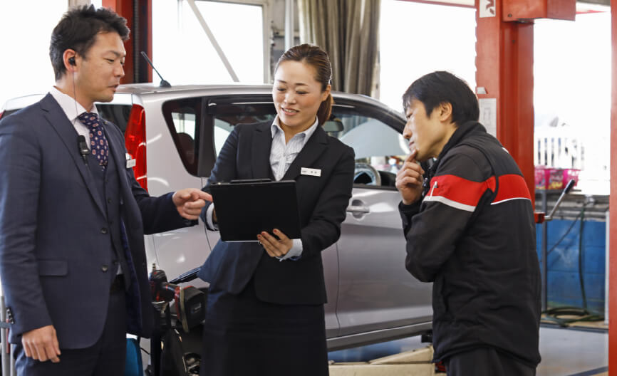車検・定期点検・修理などで来店するお客様と、サービス工場のテクニカルスタッフとの橋渡しを担当し、受付、予約管理、相談受付、クルマの状態の問診表作成などを行います。そのほか、店舗ショールームの受付カウンターで、来店される全てのお客様の接客、電話の応対から営業と工場の事務業務の一部まで幅広くこなす仕事です。時にはCAが不在の場合など、CAに代わってショールームの車の説明も行います。
