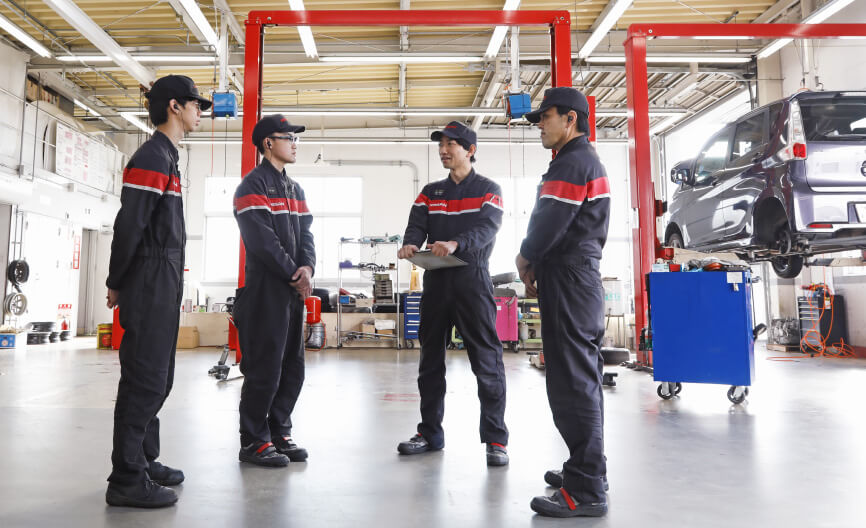 店舗や本部のサービス工場で、クルマの整備・点検・修理を行うエンジニアです。オール日産車の技術と安全を支える一員として、お客様からお預かりしたクルマをベストコンディションに保ってお返しする責任を担っています。最新のクルマの技術にもいち早く接することができます。また、お客様からの不合の相談を的確につかみ、点検や修理の内容をわかりやすく誤解のないように説明する、コミュニケーションの力も必要な仕事です。